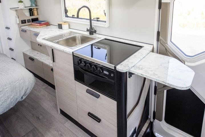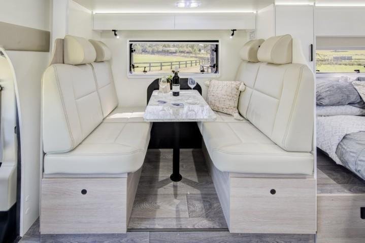Bed - Island (1370 x 1910mm) & Bed - over cabin (1370 x 1910mm), Benchtop extension, Cupboards - Handle free overhead & Soft close, Curtains and safety net for bed over cabin, Drawers - Residential Soft Close with metal runners, Floor - one piece floor, Hatch - Bathroom with 12v fan & living area, Hot Water System - 12 volt electric start/gas & 240 volt, Ladder for bed over cabin, Magazine holder, Mat - Removable cabin mat - carpet, Privacy screens - windscreen and front doors, Seating - Dinette & swivel chassis seats, Shower, Slide out - For extra living space, Storage - internal, Table - Large dining table, Toilet - with cassette, Towel hooks x 2, Wardrobe, Window in bathroom, Windows - double glazed with concertina style blind and fly screen, Windows in Luton peak
