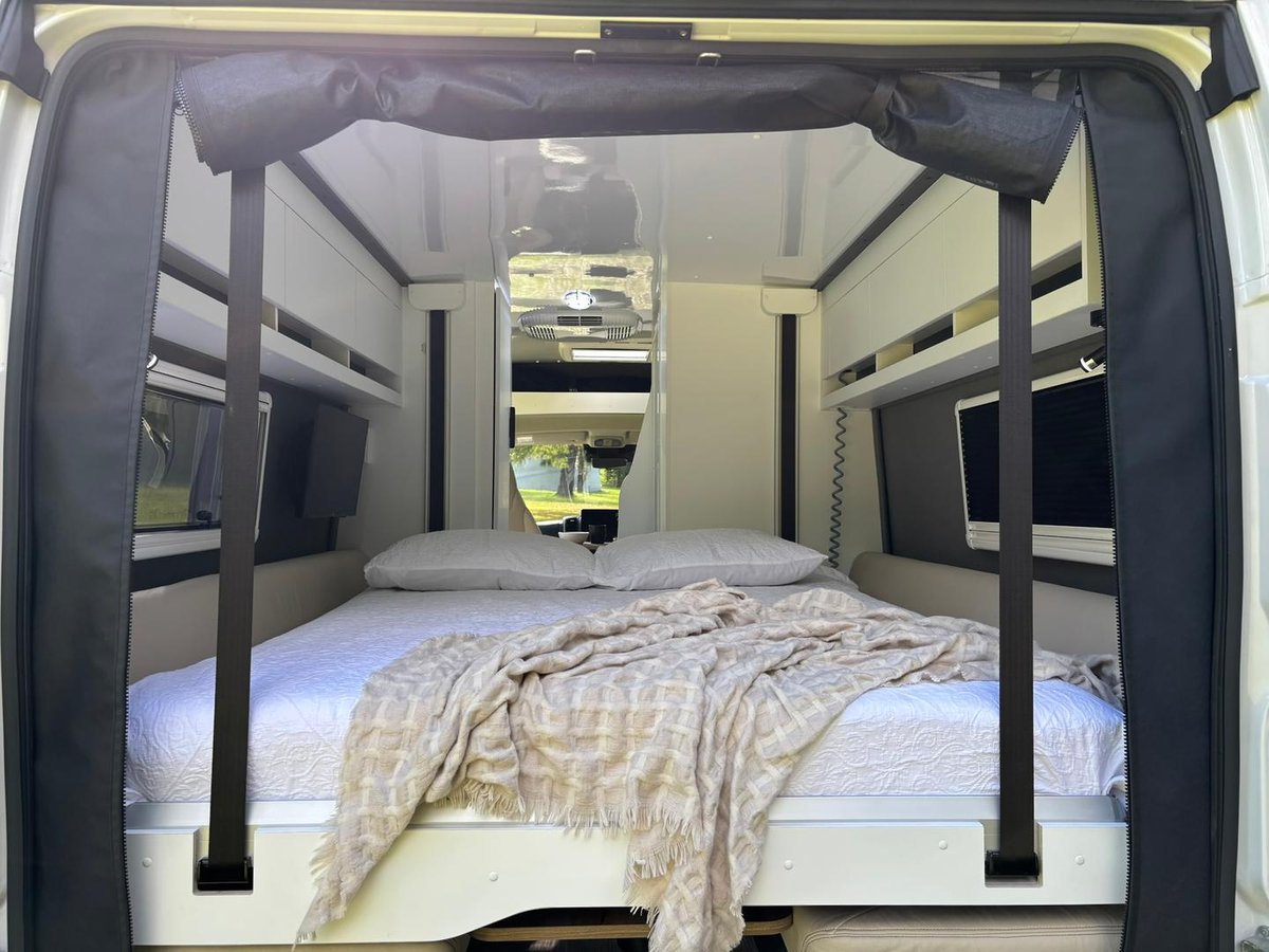 The Escape campervan is one of the most unique campervans on the market being able to sleep four. At the touch of a button, the large electric bed drops down from the ceiling.
